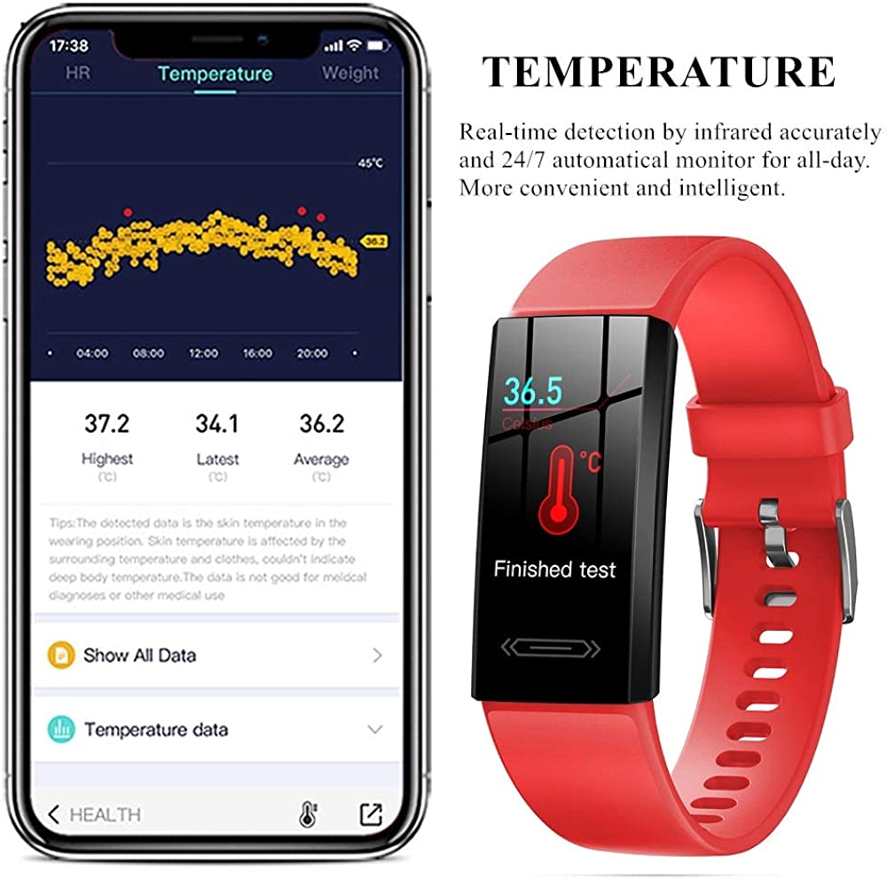 • 2021 Version Fitness Tracker with Body Temperature Heart Rate Blood Pressure Sleep Health Monitor, IP68 Waterproof Activity Tracker, Step Calorie Counter Pedometer Watch for Men Women Teens